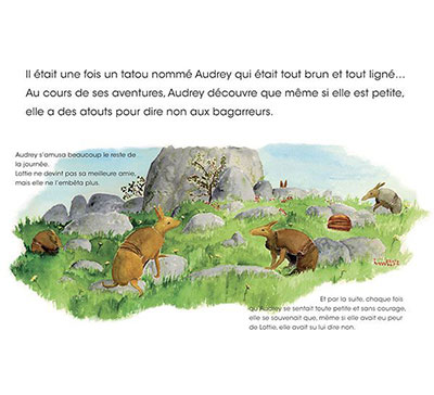 Il était une fois un tatou nommé Audrey qui était tout brun et tout ligné... Au cours de ses aventures, Audrey découvre que même si elle est petite, elle a des atouts pour dire non aux bagarreurs.